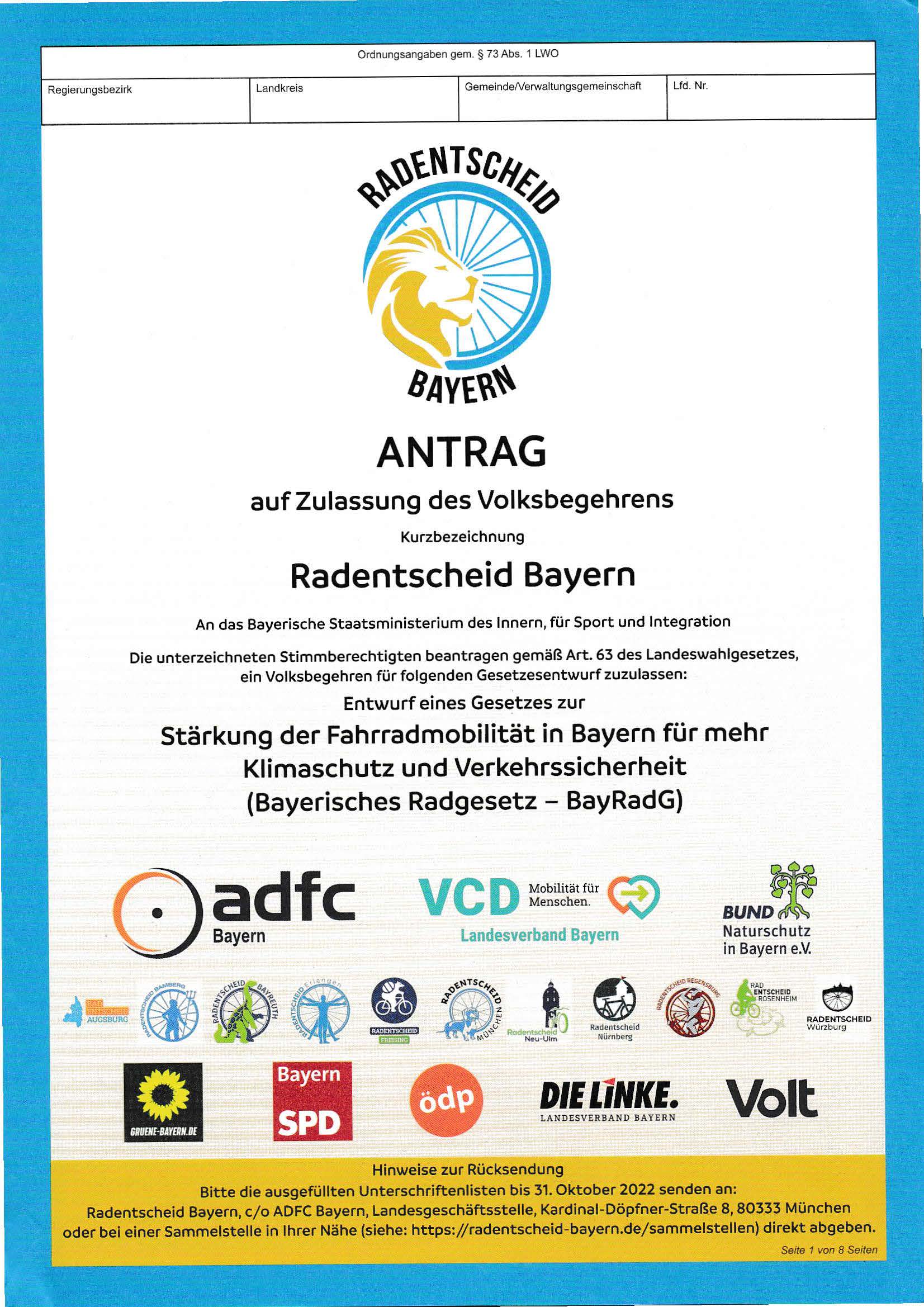 wir unterstützen das Volksbegehren zum Radentscheid Bayern und bitten um Unterschriften. Jeder kann auch eigene Listen bestellen und sie mit den Eintragungen an die Gemeindeverwaltung einreichen.