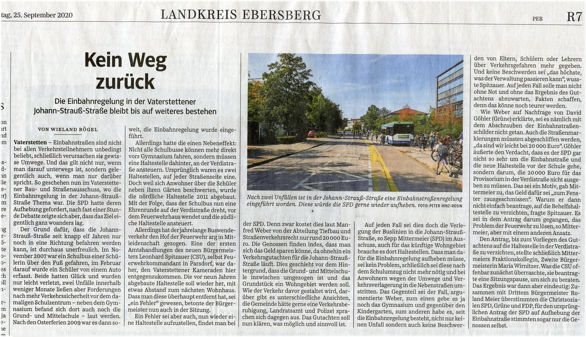 Im Bau- und Straßenausschuss vom 22.09.2020 hat Sepp Mittermeier für die SPD-Fraktion einen Antrag gestellt, die Buslinien schon gleich in die Joh.-Strauß-Str. vor das Gymnasium zu legen und die Einbahnstraßenregelung aufzuheben Der Antrag wurde abgelehnt. (s. Protololl der Sitzung vom 28.09.2020 TOP 5)